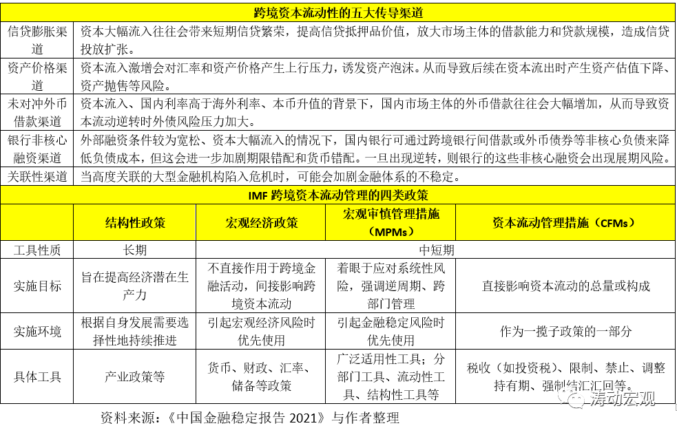IMF等相關研究表明,跨境資本流動的風險傳導可以分為信貸膨脹、資產價格、未對沖外幣借款、銀行非核心融資、關聯(lián)性五類渠道,且這五類渠道之間會通過反饋效應相互強化。同時IMF通過《二十國集團基于國家經(jīng)驗得出的資本流動管理一致性結論》(2011年)和《資本流動開放與管理:機構觀點》(2012年)等文件構建了針對跨境資本流動的政策框架。
