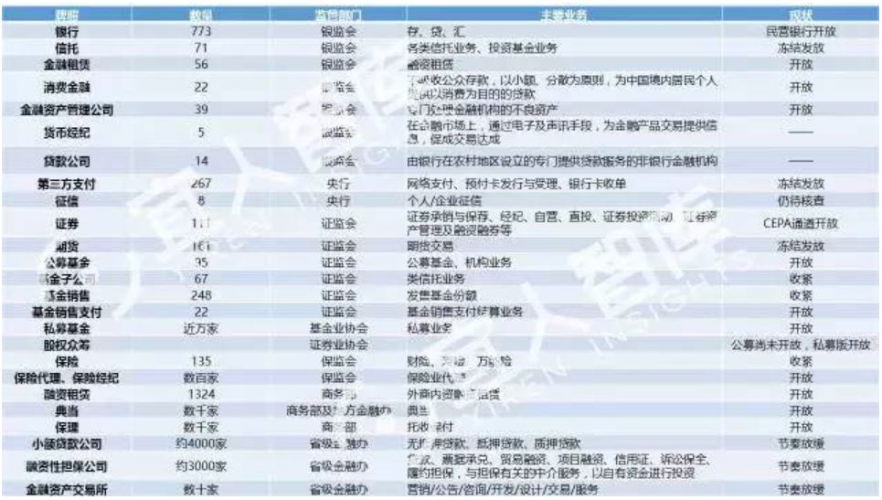 目前,我國的金融牌照由 “一行三會”及其他監管部門發出,即“央行、銀監會、證監會、保監會”,由于銀監會和保監會合并為銀保監會,現在應該是“一行兩會”了。金融監管根據時段劃分為事前監管、事中監管、事后監管,市場準入制度是事前監管的核心,金融許可證則是市場準入制度的常態表現。目前金融牌照主要分布在銀行、證券、期貨、保險、基金、信托、租賃七個領域中。