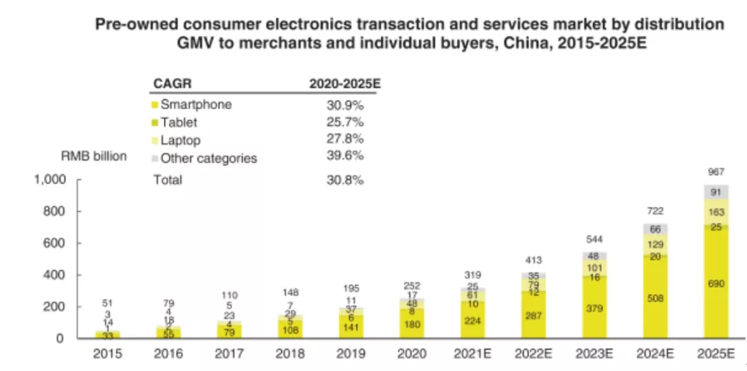 不同于二手房與二手車的高市場滲透率,二手3C行業在中國起步較晚,到目前該行業僅僅發展了十年時間。據灼識咨詢(CIC)的數據,2015年至2020年,中國二手3C行業的市場規模由510億元增至2252億元,年化復合增長率高達34.5%。