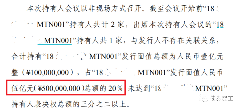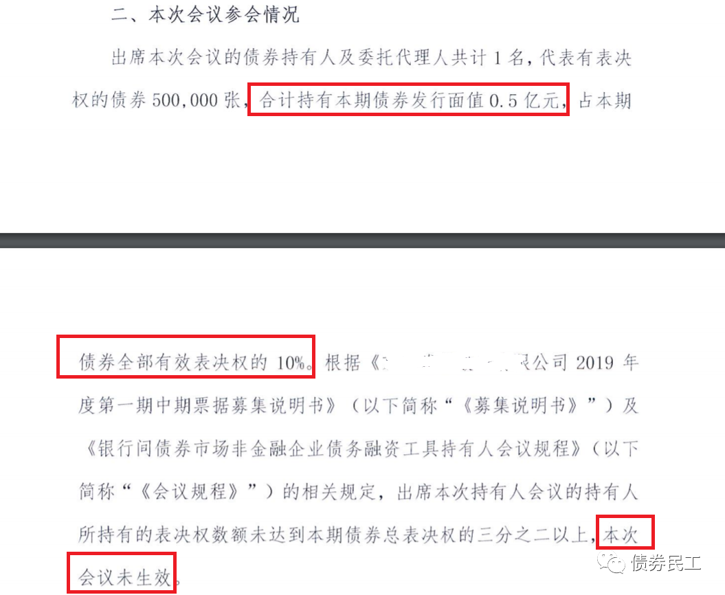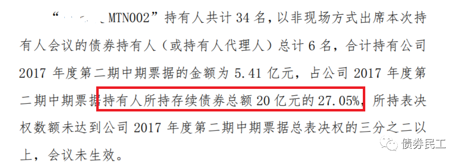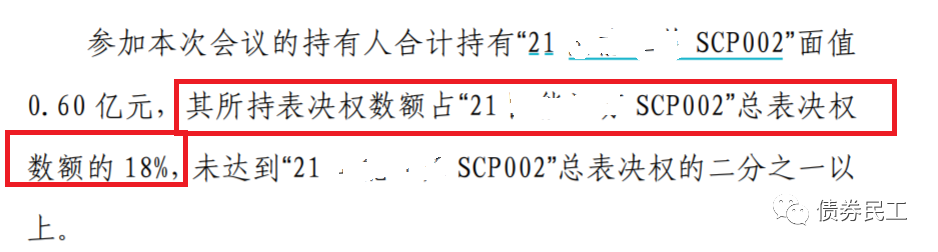 持有人會議未生效的主要原因是參會的持有人數不夠,注意是參會人數未達到約定的標準,不是投反對票的人數。但是也真沒想到,部分債券持有人會議的參會比例會是如此之低。讓我們一起來看幾個近期未生效的債券持有人會議案例: