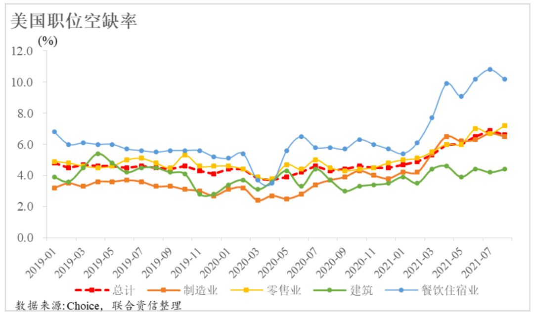 3.勞動力供需失衡導致美國職位空缺率大幅上漲,其中餐飲旅游業、零售業等對社交限制更加敏感的行業職位空缺率明顯更高。