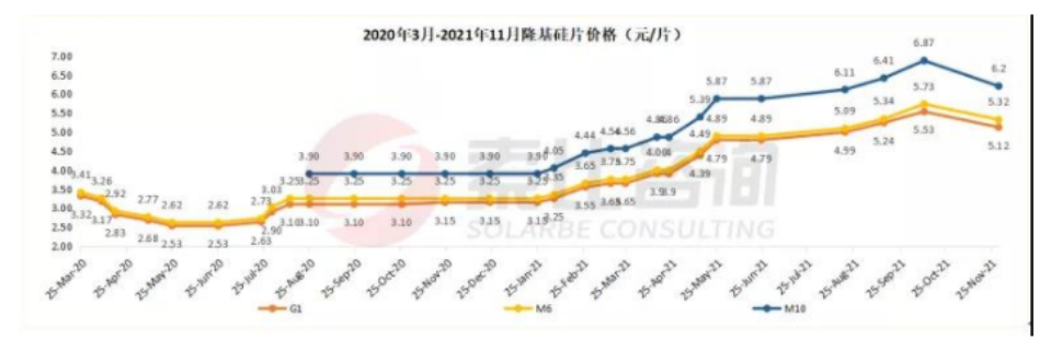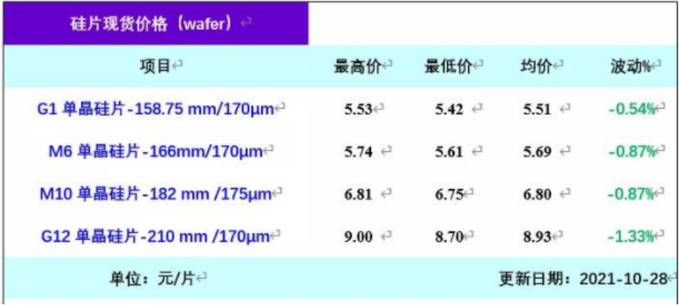 10月下旬,因光伏產業鏈價格持續上漲,終端電站建設需求低迷,硅片出現了小幅下滑的跡象。由于對年末搶裝的預期,硅片價格隨后企穩。