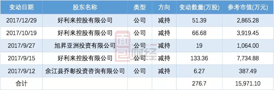 2017年9月12日-2017年12月29日,實控人控制的好利來控股、旭昇亞洲投資以及高管們的持股平臺余江縣喬彰、余江縣衡明一共減持6次,累計減持276.7萬股,參考市值近15,971.10萬元。以下為公開披露的持股變動記錄: