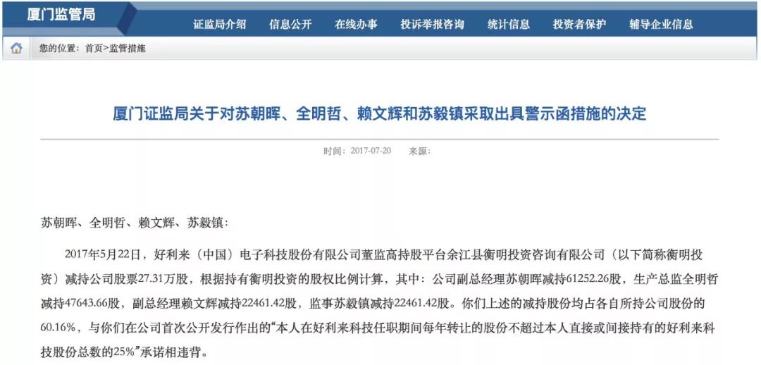 而在此之前,2017年7月,好利來的高管蘇朝暉、全明哲、賴文輝和監事蘇毅鎮因通過持股平臺余江縣衡明違規減持收到廈門證監局出具的警示函: