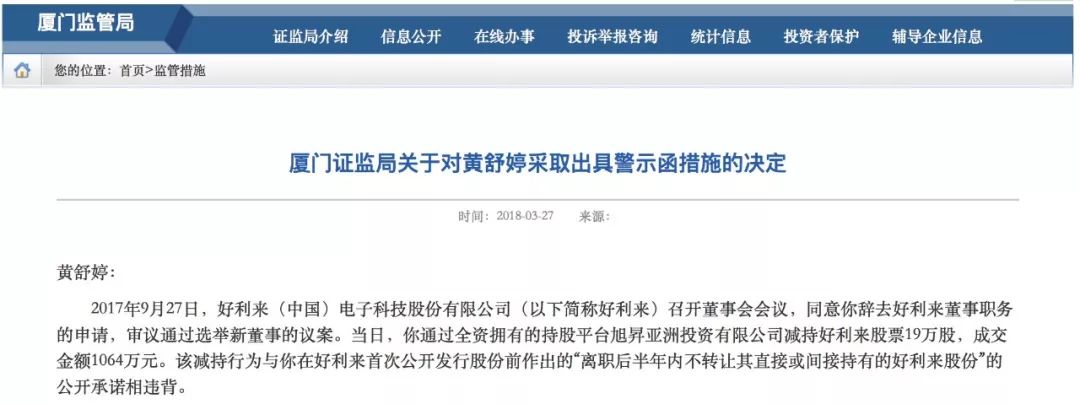 在警示函中證監會要求公司“吸取教訓,引以為戒,嚴格按照有關規定減持股份,杜絕此類事件再次發生”。然而僅僅時隔兩個月,好利來的實控人黃舒婷再次違規減持,又遭到的監管部門的處罰: