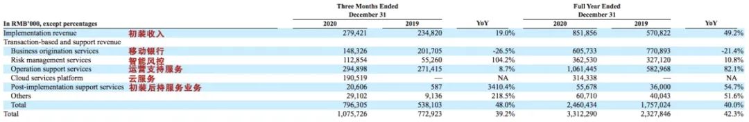 交易運(yùn)營(yíng)收入則是除完成平臺(tái)建設(shè)外,還繼續(xù)為客戶提供技術(shù)支持和運(yùn)營(yíng)服務(wù),具體包括——移動(dòng)銀行、智能風(fēng)控、運(yùn)營(yíng)支持服務(wù)、初裝后持服務(wù)業(yè)務(wù),以及云服務(wù)。