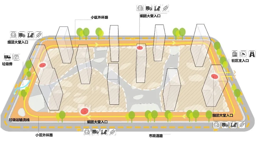 外部人員只能在這條外環上活動,不能進入社區內部。想象一下,你結束一天的工作后回到社區。從外環線上進入到小區內部后,能瞬間從嘈雜的車流人流中,回歸清靜。