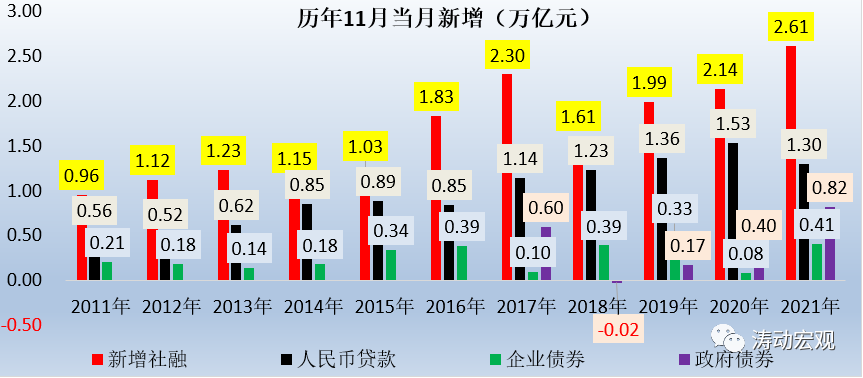 債券同比明顯多增的因素主要有兩個,政府債券是因為地方政府在10-11月放量發行,企業債券則是由于去年11月受河南永煤事件影響導致同期基數較低。