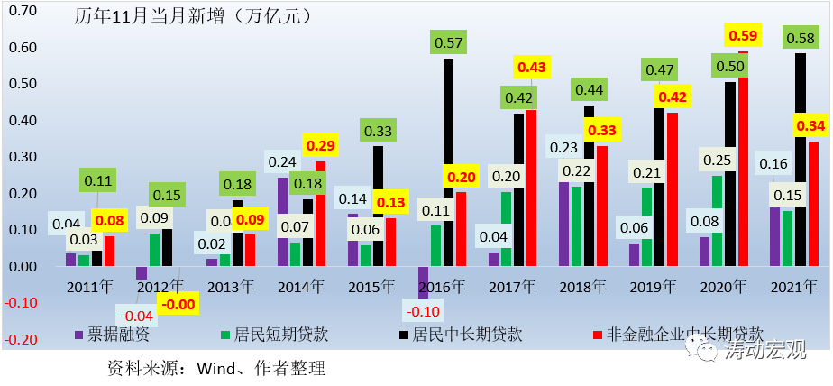 1、受限電限產、疫情多點擴散等因素影響,企業中長期貸款需求仍然延續10月的弱勢,同比明顯少增。今年11月,企業中長期貸款新增0.34萬億,同比大幅少增0.25萬億(10月同比少增0.19萬億元),表明實體經濟融資需求不足,資產荒問題較為突出。實際上,今年7-11月,企業中長期貸款同比均明顯少增(合計少增1.12萬億元)。