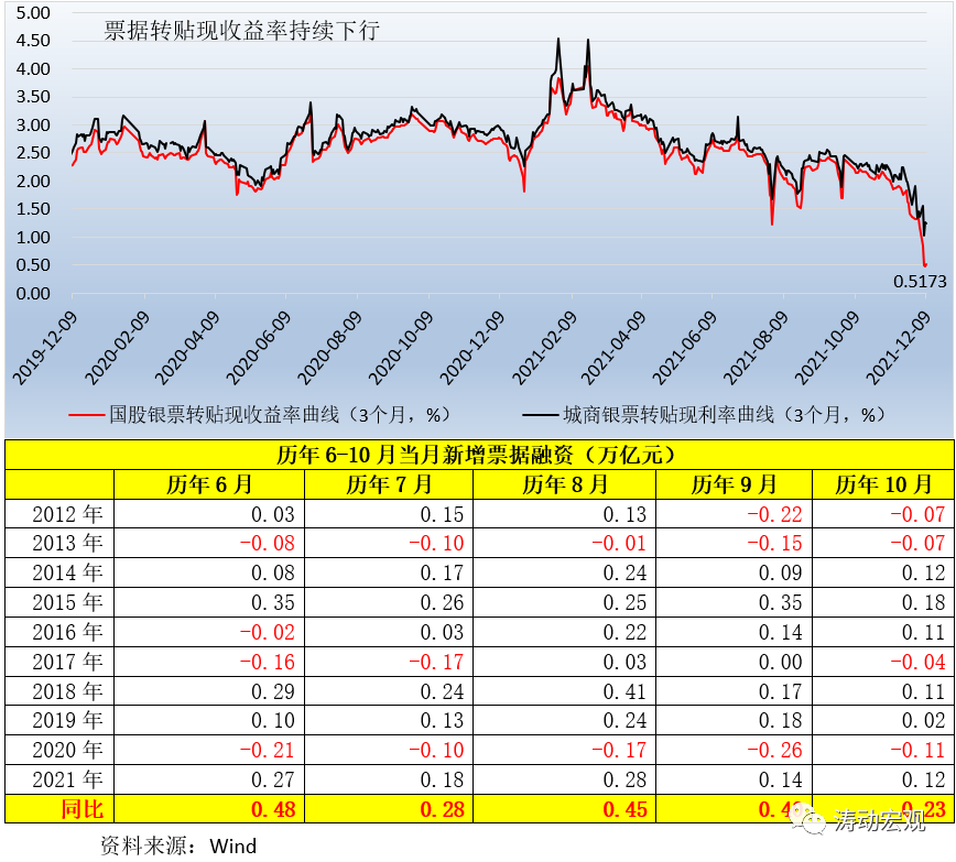 1、今年6月、7月、8月、9、10月和11月當月新增票據融資分別達到0.27萬億、0.18萬億、0.28萬億、0.14萬億、0.12萬億和0.16萬億元,同比分別多增0.49萬億、0.28萬億、0.45萬億、0.40萬億、0.23萬億和0.03萬億,也就是說6-11月期間票據融資累計多增了1.87萬億。這其中的背景便是,3個月銀票轉貼現收益率持續下行,特別是10月以來已累計下行200BP至0.50%附近。