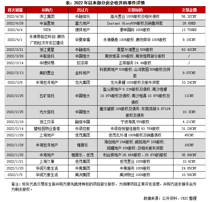 自2021年下半年開始,隨著部分房企流動性危機的出現,出險房企急于打通項目股權出售渠道,市場上的并購機會逐步增多。與此同時,監管層鼓勵并購貸款、并購票據等金融融資工具用于行業出清、房企出險,對房企進行收并購起到了正面推動作用。