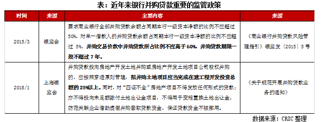 2008年至2015年的七年間,銀行對申請并購貸房企的自有資金要求很低。然而2015年銀監會修訂《商業銀行并購貸款風險管理指引》,提高并購貸準入門檻,要求并購交易價款中并購貸款所占比例不應高于60%。2018年1月底,上海銀監局下發《關于規范開展并購貸款業務的通知》,對房企準入門檻和并購貸投向上的要求更為嚴格,將原適用于開發貸的“432”條件也適用于并購貸,同時強調并購貸款投向房地產開發土地并購或房地產開發土地項目公司股權并購的,應按照穿透原則管理,擬并購土地項目應當完成在建工程開發投資總額的25%以上,并對“四證不全”房地產項目不得發放任何形式的貸款,亦不得投向未足額繳付土地出讓金項目,不得用于變相置換土地出讓金。但在當前實際操作中,針對首批12家出險房企,近期監管表態涉及四證不全并購項目、并購貸款置換土地出讓金等合規性要求可能有所放松。
