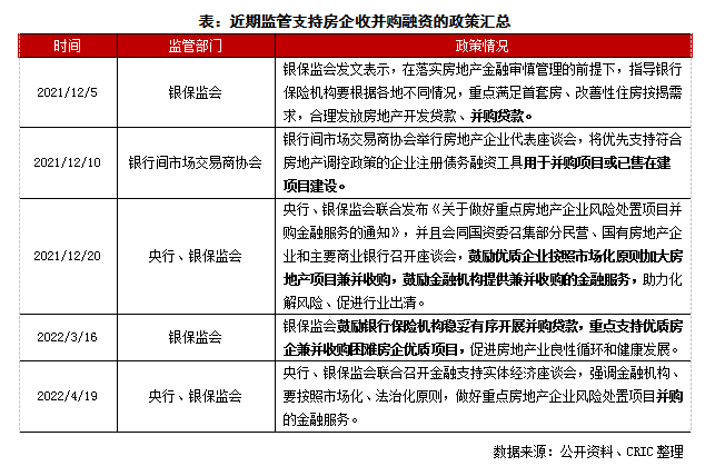 2021年12月5日,銀保監會指導金融機構重點滿足首套房、改善性住房按揭需求,合理發放房地產開發貸款和并購貸款,并購貸款被首次提及;10日交易商協會舉行房地產企業代表座談會,優先支持注冊發行債券用于并購及項目建設,房企并購票據迎來政策突破;20日央行、銀保監會聯合印發《關于做好重點房地產企業風險處置項目并購金融服務的通知》,鼓勵優質房企按市場化原則并購出險房企項目,鼓勵金融機構提供并購金融服務,其中提到對兼并收購出險和困難房地產企業項目的并購貸款暫不納入房地產貸款集中度管理,加速銀行并購貸款的投放。進入2022年為調動房企收并購積極性,1月據市場消息稱,針對出險房企項目的承債式收購,相關并購貸款不計入“三道紅線”相關指標。3月16日六部門密集表態房地產,再次強調金融機構穩妥有序開展并購貸款。