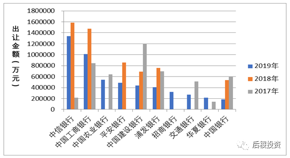 經過數據整理,我們發現共有53家銀行的交易記錄,其中出讓金額最大的是中信銀行,達到134.1億元。五大國有銀行均位列上表所示前十大銀行,前十大銀行全年累計出讓資產金額約521億元,所占比重接近八成。另外,圖二我們也能更直觀感受銀行三年變化,比如中信銀行和工商銀行出讓金額這兩年保持前二;建設銀行、中國銀行等出讓金額逐年減少;