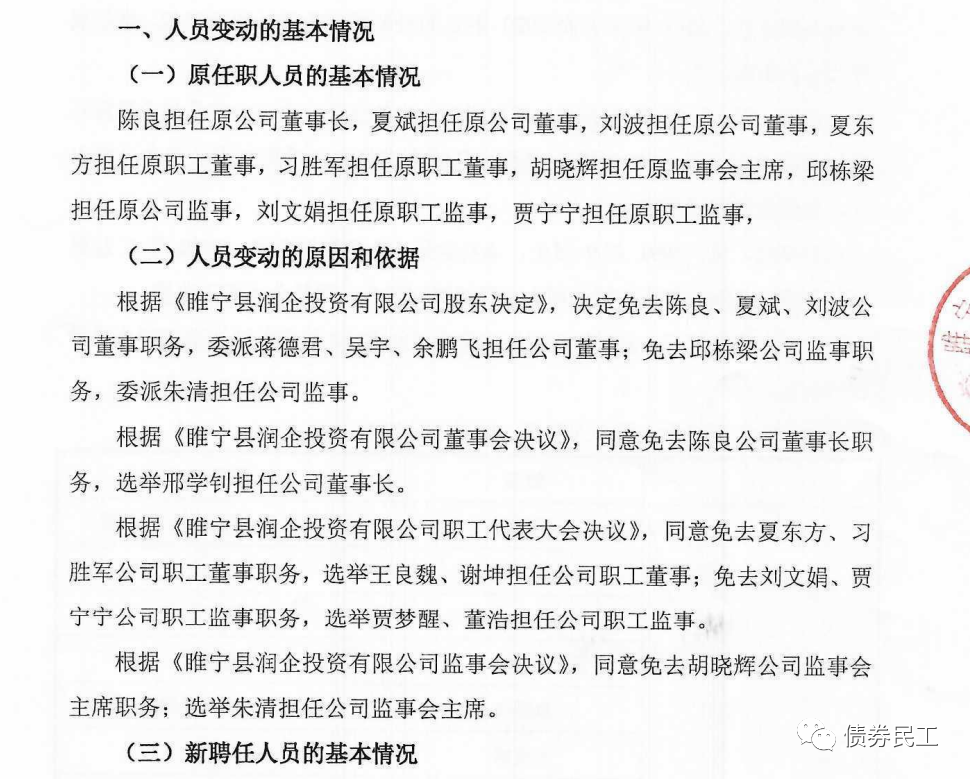 1、2022年1月18日,睢寧縣潤企投資有限公司發(fā)布公告,公司的董事長、監(jiān)事會(huì)主席以及部分董事、部分監(jiān)事進(jìn)行了變更。