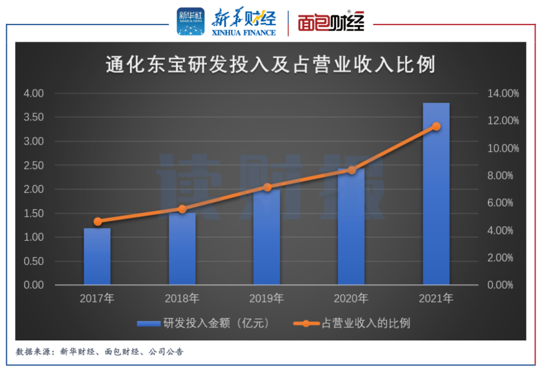 數據顯示,2017年至2021年,通化東寶的研發投入金額從1.19億元上升至3.80億元,同期研發投入占營業收入的比例從4.68%上升至11.63%。其中,2021年出現加速增長,研發投入金額同比增加超過50%。