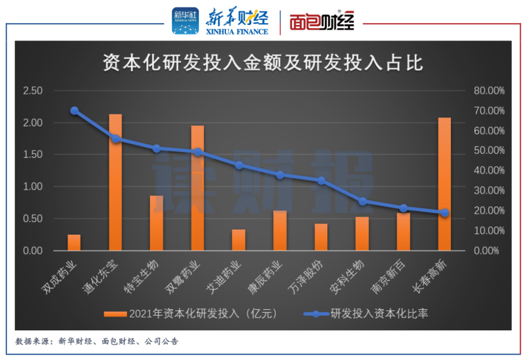但另一方面,通化東寶研發投入資本化比例明顯較高。數據顯示,公司2021年合計3.80億元的研發投入中,資本化的金額為2.13億元,占比達56.11%。