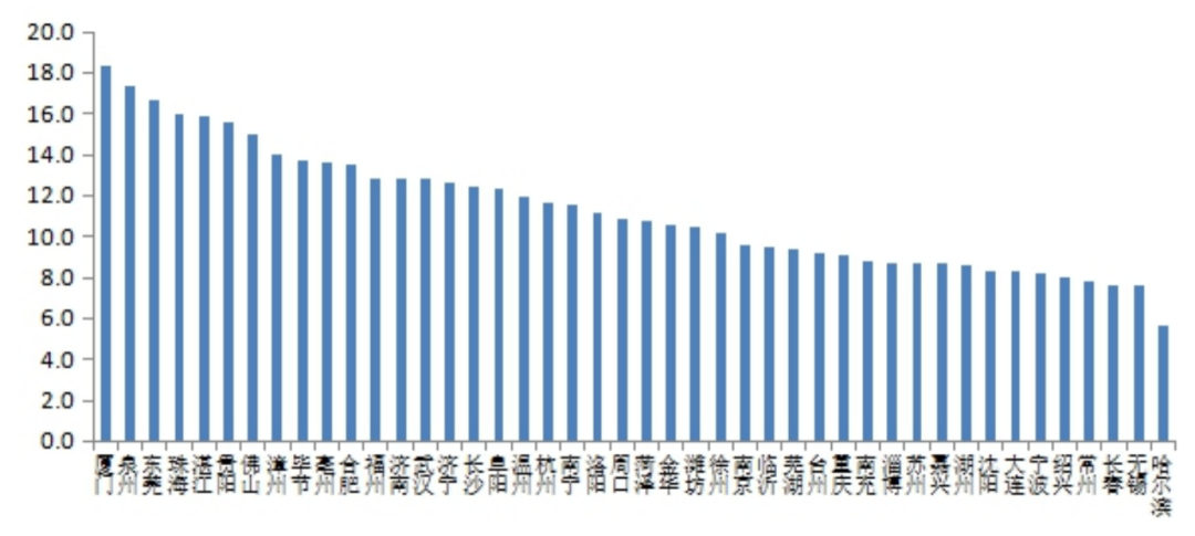 就一二線城市來看,出生率越高的城市,房價上漲幅度也越大,典型如西安、貴陽,房價漲幅均在8成以上;而出生率比較低的天津、哈爾濱,其房價漲幅均未超過25%。