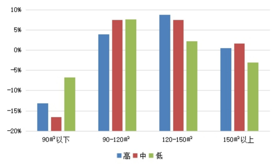 與此同時,受“全面二胎”政策影響,近年來住宅市場產品成交結構向中大面積產品傾斜,據典型城市在2016-2019年間的住宅成交結構來看,期間出生率增加的城市,其120-150平方米面積段的住宅產品市場份額均是增加的,平均增幅顯著高于出生率下降的城市。這說明出生率提升,住宅市場上改善需求也會相對較多,對中大戶型面積段的產品需求比例也會因此上漲。