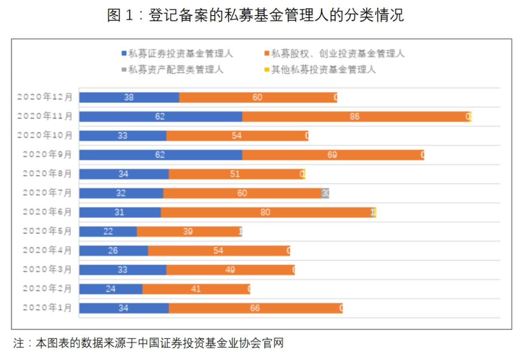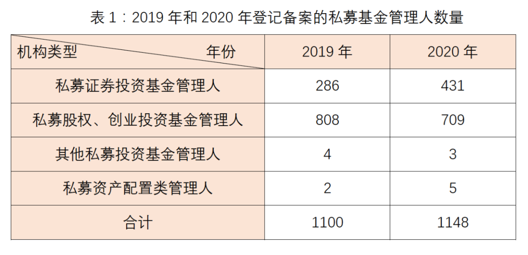 1.2019年登記備案的私募基金管理人共1100家,其中私募證券投資基金管理人286家,私募股權、創業投資基金管理人808家,其他私募投資基金管理人4家,私募資產配置類管理人2家。2020年登記備案的私募基金管理人共1148家,其中私募證券投資基金管理人431家,私募股權、創業投資基金管理人709家,其他私募投資基金管理人3家,私募資產配置類管理人5家。