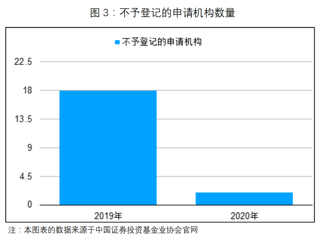 中基協自2020年始公示中止機構的數據,2020年中止登記的申請機構共157家,中止率達到12.0%,意味著2020年新規出臺后,中止將成為中基協常態化的反饋。而且,中止辦理的情形不能僅按字面意思理解,在實務中個別情形有延伸的情況。目前已明確被中止的原因大致有股權結構不穩定、實際控制人存在競業禁止情況、高管勝任能力不足、場所不穩定、具有基金從業資格的員工過少等。
