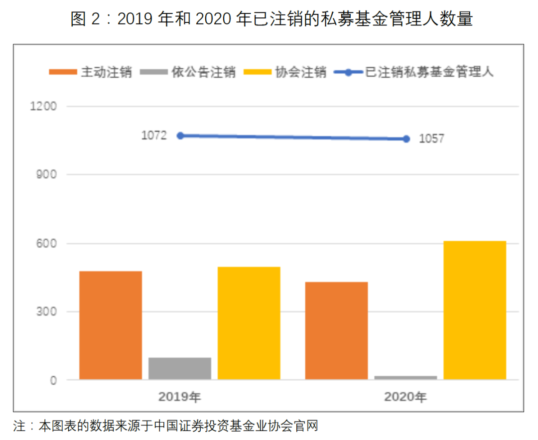 2019年已注銷私募基金管理人共1072家,其中主動注銷的私募基金管理人479家,依公告注銷的私募基金管理人97家,協會注銷的私募基金管理人496家。2020年已注銷私募基金管理人共1057家,其中主動注銷的私募基金管理人431家,依公告注銷的私募基金管理人18家,協會注銷的私募基金管理人608家。