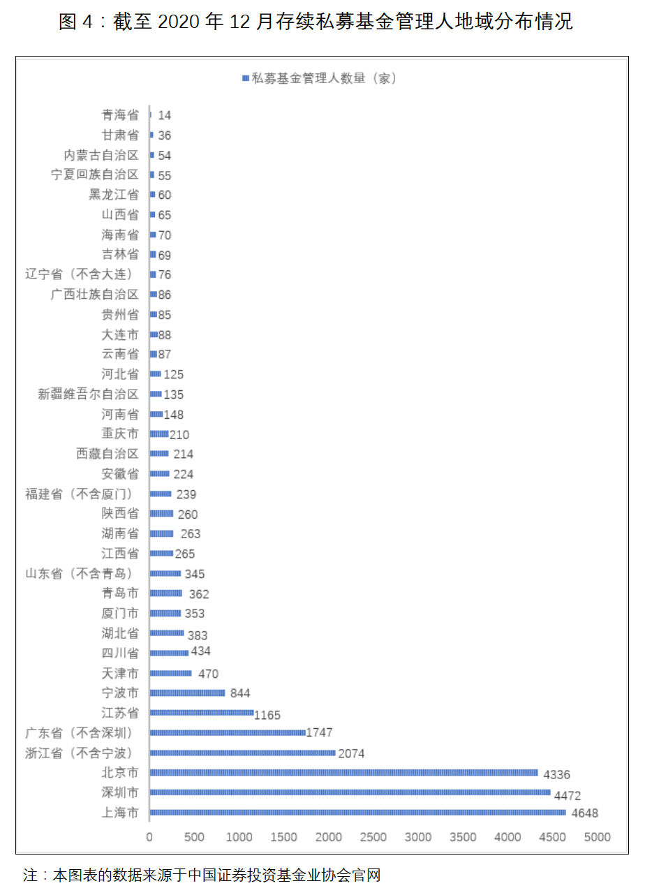 截至2020年12月,在中基協登記備案的私募基金管理人共24561家,其中大部分分布在北上廣深等經濟發達城市,上海市共存續4648家私募基金管理人,居于首位;深圳市次之,共存續4472家私募基金管理人,遠超廣東省其他城市;北京市居第三位,共存續4336家私募基金管理人。