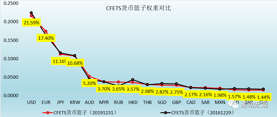 3、自2017年開始交易中心按年評估CFETS人民幣匯率指數的貨幣籃子,并根據情況適時調整籃子的構成或相關貨幣權重(貨幣籃子調整情況于當年年末公布,自次年1月1日起生效)。截止目前交易中心已經分別于2016年12月29日和2019年12月31日兩次調整CFETS籃子貨幣權重。且調整方向也是比較明確,即降低美元權重,同時提高貿易規模趨于增長經濟體的貨幣權重。