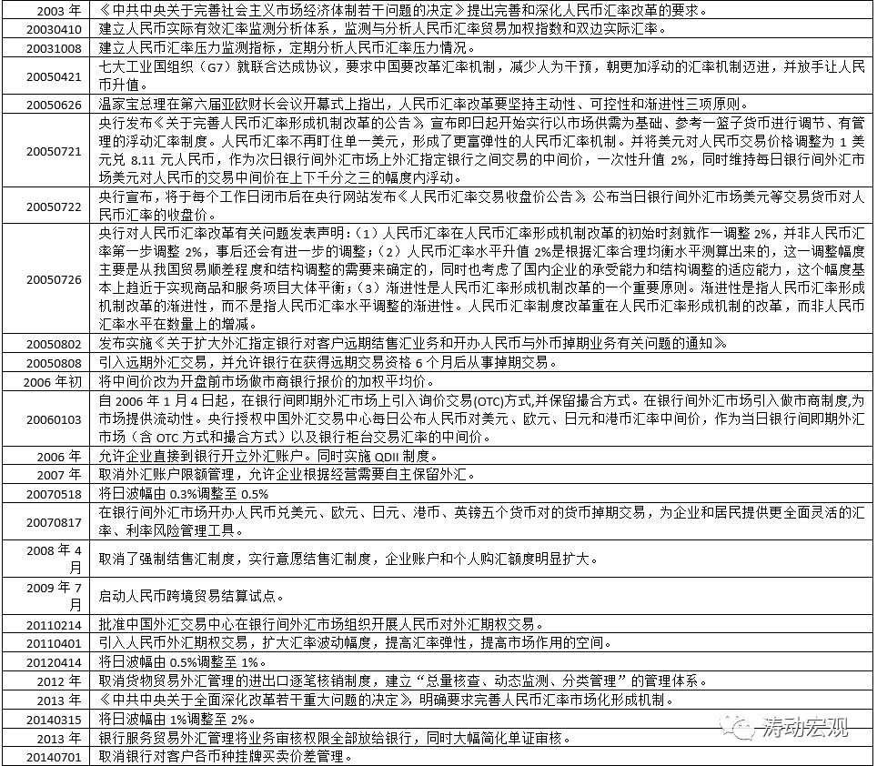 這一時期的匯率市場化改革主要依據三個文件,分別為1993年的《中共中央關于建立社會主義市場經濟體制若干問題的決定》(明確了1994年匯改的方向)、2003年的《中共中央關于完善社會主義市場經濟體制若干問題的決定》(提出加入WTO后加快匯率市場化改革要求)以及2013年的《中共中央關于全面深化改革若干重大問題的決定》(奠定新一輪匯改的基調)。回過頭來看,1994年是一個極具歷史意義的年份,當時的外匯體制改革基本奠定了我國后續25年的匯率市場化改革模式,如銀行間外匯市場、銀行結售匯制度、日波幅管理等等。
