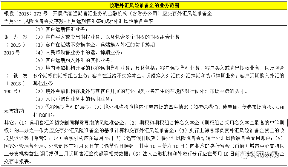 第三,2018年8月3日,央行發布《關于調整外匯風險準備金政策的通知》(銀發〔2018〕190號),將繳存業務范疇分為三大類。