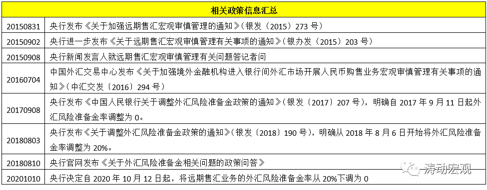 (1)2015年8.11匯改后,為抑制外匯市場過度波動,2015年8月31日央行發布《關于加強遠期售匯宏觀審慎管理的通知》(銀發(2015)273號),明確將外匯風險準備金納入宏觀審慎管理框架,自2015年10月15日起,開展代客遠期售匯業務的金融機構(含財務公司)應交存外匯風險準備金(準備金率為20%),同時外匯風險準備金的凍結期為1年、按月交存、準備金利率為0且按照簽約金額而非余額繳存。