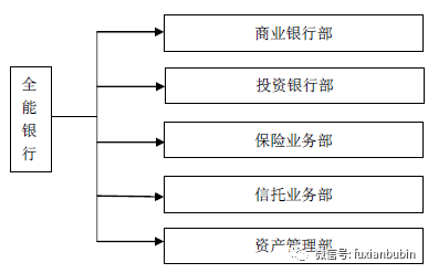 從全能銀行的組織架構上來看,一般來說,其內部會設置平級的金融業務部門,全面經營商業銀行、投資銀行、保險、信托、資產管理等項業務,多種業務混合、交叉經營,并實行一級法人制。在這種模式中銀行是一種名副其實的金融百貨公司,客戶只要到銀行來,所有的金融業務都可在此辦理。商業銀行及證券承銷業務就像一家大型百貨公司內部兩個不同部門,其規模經濟效應最為明顯。