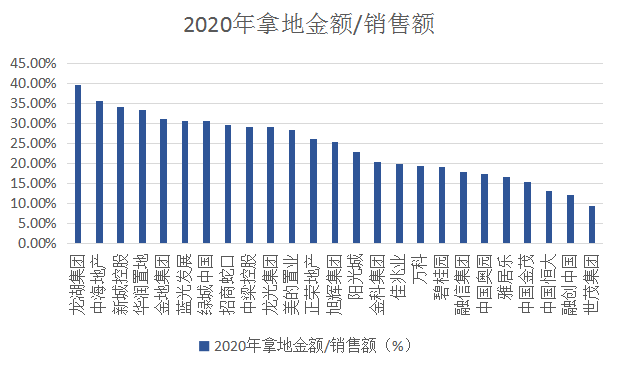 事實(shí)上,從2020年30強(qiáng)開(kāi)發(fā)商拿地金額與年度銷(xiāo)售額之比來(lái)看,絕大部分30強(qiáng)開(kāi)發(fā)商實(shí)際拿地金額與銷(xiāo)售比大約在15%~30%,其中龍湖集團(tuán)、中海地產(chǎn)占比較高,分別為39.57%、35.55%。