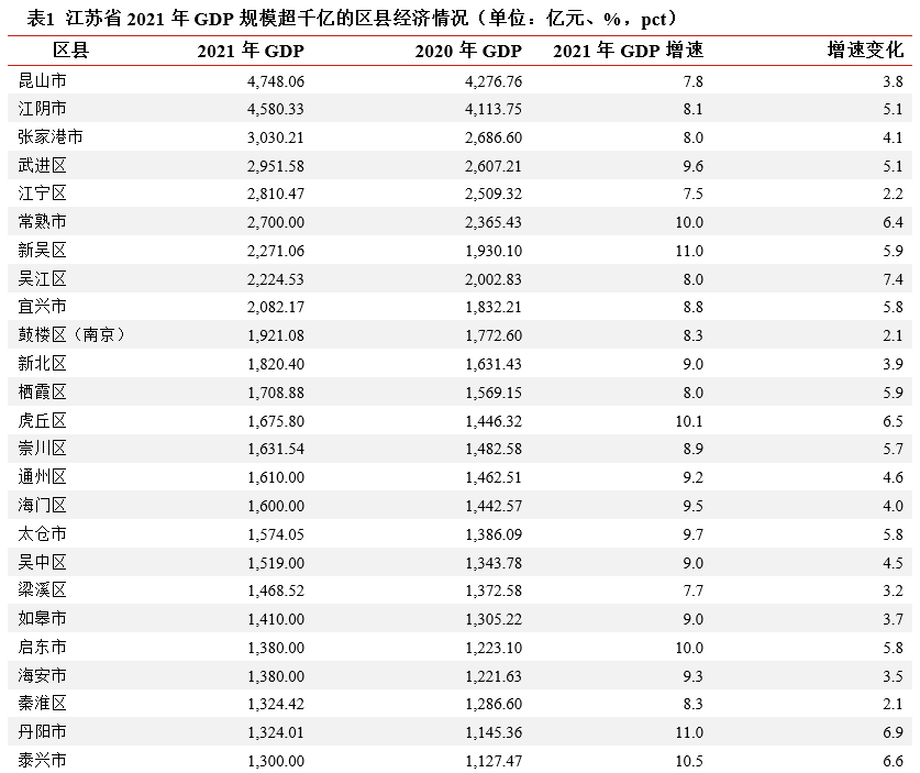 2021年除邗江區(qū)外,江蘇省其他各區(qū)縣GDP規(guī)模均有所提升,響水縣GDP增速下滑0.1個(gè)百分點(diǎn)。2021年江蘇省各區(qū)縣GDP規(guī)模大多處于增長狀態(tài),其中昆山、江陰和張家港市GDP規(guī)模仍處于頭部位置,且2021年張家港GDP突破三千億大關(guān),新吳區(qū)和宜興市則突破兩千億大關(guān)。但邗江區(qū)2021年GDP下滑10.72億元至1,117.29億元。GDP增速方面,除盱眙縣、沛縣、贛榆區(qū)和豐縣未獲得GDP增速外,2021年江蘇省大部分區(qū)縣GDP增速均高于2020年,但響水縣GDP增速下滑0.1個(gè)百分點(diǎn)至6.0%。