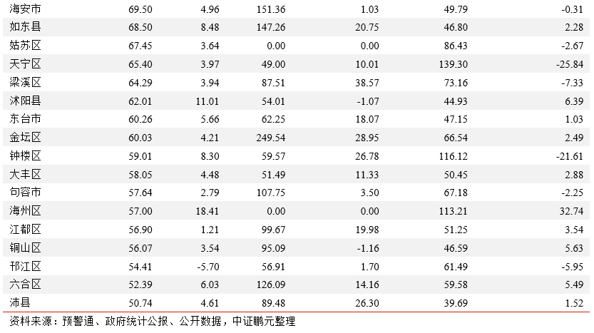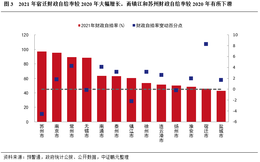 財(cái)政情況:2021年宿遷財(cái)政自給率大幅提高,95個(gè)區(qū)縣中有33個(gè)區(qū)縣財(cái)政自給率表現(xiàn)弱于去年。2021年江蘇省各地級(jí)市一般公共預(yù)算收入和政府性基金收入均較2020年有所提高,2021年宿遷財(cái)政自給率表現(xiàn)亮眼,較2020年提高8.28個(gè)百分點(diǎn)至45.80%,蘇州、南京、常州和無錫經(jīng)濟(jì)實(shí)力依舊較強(qiáng)、財(cái)政自給率依舊較高。區(qū)縣層面,2021年江蘇省絕大部分區(qū)縣一般公共預(yù)算收入和政府性基金收入均有所增長,昆山、江陰和江寧區(qū)一般公共預(yù)算收入仍穩(wěn)居頭部,但2021年邗江區(qū)一般公共預(yù)算收入下滑5.70億元至54.41億元,吳江區(qū)政府性基金收入下滑64.39億元至171.04億元,相城區(qū)、京口區(qū)、天寧區(qū)、吳江區(qū)和鐘樓區(qū)財(cái)政自給率較去年同期下降20個(gè)百分點(diǎn)以上。