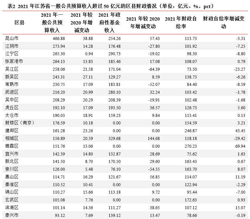 2021年江蘇省絕大部分區(qū)縣一般公共預(yù)算收入較2020年均有增長,但18個(gè)區(qū)縣政府性基金收入下滑,33個(gè)區(qū)縣財(cái)政自給率表現(xiàn)弱于2020年。一般公共預(yù)算收入方面,2021年昆山、江陰和江寧區(qū)一般公共預(yù)算收入仍穩(wěn)居頭部,邗江區(qū)一般公共預(yù)算收入較2020年下滑5.70億元至54.41億元。受2021年房地產(chǎn)市場(chǎng)疲軟影響,2021年江蘇省有18個(gè)區(qū)縣政府性基金收入較2020年有所下滑,其中吳江區(qū)下滑幅度最大,當(dāng)年政府性基金收入下滑64.39億元至171.04億元。2021年崇川區(qū)、常熟市和江陰市政府性基金收入較2020年分別下滑54.55億元、52.07億元和27.80億元。財(cái)政自給率方面,2021年江蘇省95個(gè)區(qū)縣中有33個(gè)區(qū)縣財(cái)政自給率表現(xiàn)弱于去年,相城區(qū)、京口區(qū)、天寧區(qū)、吳江區(qū)和鐘樓區(qū)財(cái)政自給率較去年同期下降20個(gè)百分點(diǎn)以上。