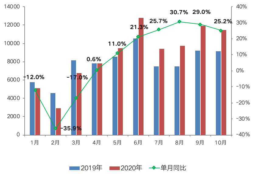 受疫情影響,百強房企銷售業(yè)績在4月同比轉(zhuǎn)正后,至8月迅速“回血”,9月“三道紅線”資管新規(guī)試行,房企拿地、開發(fā)、銷售節(jié)奏都受到較大的影響,市場漸有走弱跡象,10月房地產(chǎn)市場進一步降溫。