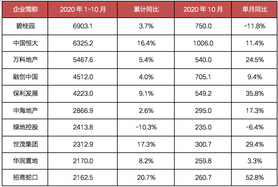 從企業(yè)業(yè)績表現(xiàn)來看,2020年10月,TOP100房企中有近8成企業(yè)實現(xiàn)單月業(yè)績同比提升。截至10月末,已有超8成房企累計業(yè)績超過去年同期,實現(xiàn)同比增長。