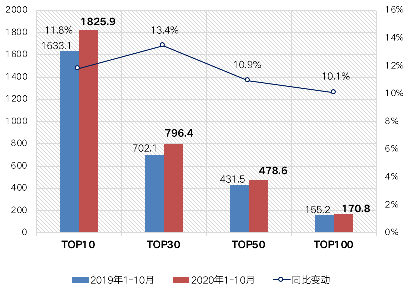截至10月末,TOP100房企操盤金額門檻達到170.8億元,門檻增速為10.1%,較去年同期也有明顯提升。