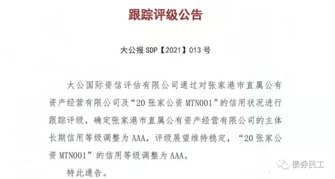 根據(jù)大公國際2021年6月3日披露的跟蹤評級公告,將張家港市直屬公有資產(chǎn)經(jīng)營有限公司(以下簡稱“張家港資產(chǎn)”)的主體長期信用等級由AA+調(diào)整為AAA,成為2021年第3個主體信用評級調(diào)升至AAA的發(fā)行人(前一個為常德財鑫融資擔(dān)保有限公司),也是2021年唯一一個主體主體信用評級調(diào)升至AAA的城投公司。根據(jù)評級報告的內(nèi)容,張家港資產(chǎn)本次主體信用評級調(diào)升的原因主要是張家港市經(jīng)濟和財政實力繼續(xù)增強、水務(wù)業(yè)務(wù)和燃氣業(yè)務(wù)經(jīng)營良好、公司投資收益同比大幅增長和政府補助的有力支持等。