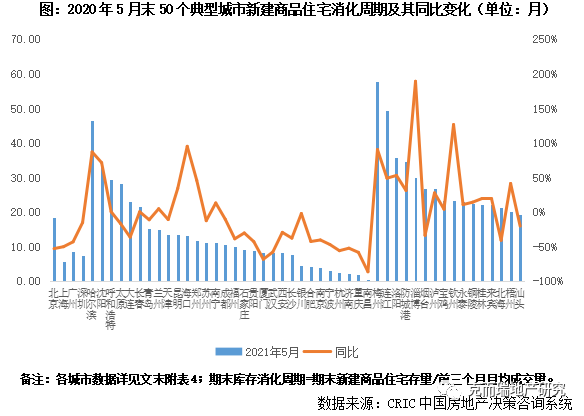 縱觀2021年上半年百城消化周期變動趨勢,1-4月基本在12個月左右持穩,5月得益于狹義庫存微降,成交熱度延續,與上月基本持平,去化周期穩中有降,由2021年4月末的12.34個月微降至10.79個月,顯著低于2020年同期水平。