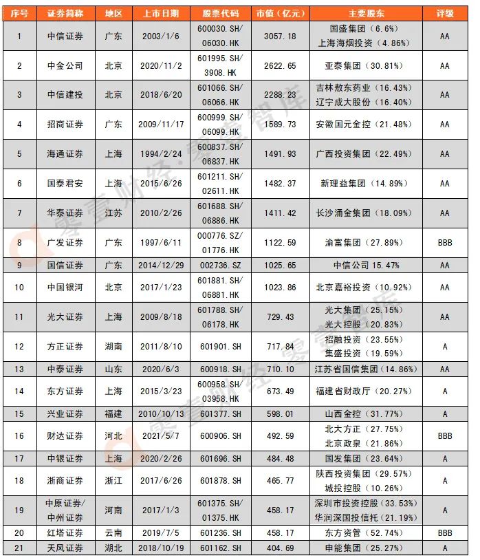 同時在A股和H股上市的有13家,其中,海通證券、光大證券、東方證券、國泰君安注冊地為上海,中國銀河、中信建投、中金公司注冊地為北京,注冊地為廣東的分別為中信證券、廣發(fā)證券、招商證券,華泰證券、國聯(lián)證券注冊地為江蘇,中原證券注冊地為河南。
