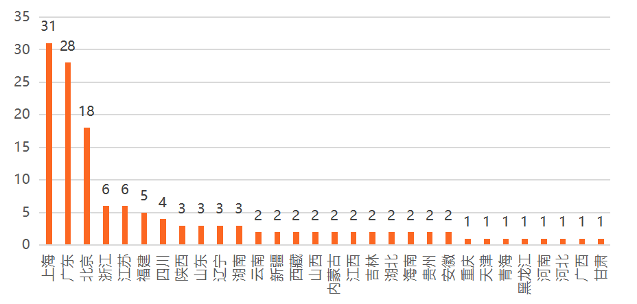 √ 截至2021年7月2日,已注冊證券公司有140家(包括券商資管子公司及投行子公司),從注冊地址來看,這些券商分布在30個省市,其中上海市31家,廣東省28家,北京市18家,三地合計77家,占比55%。
