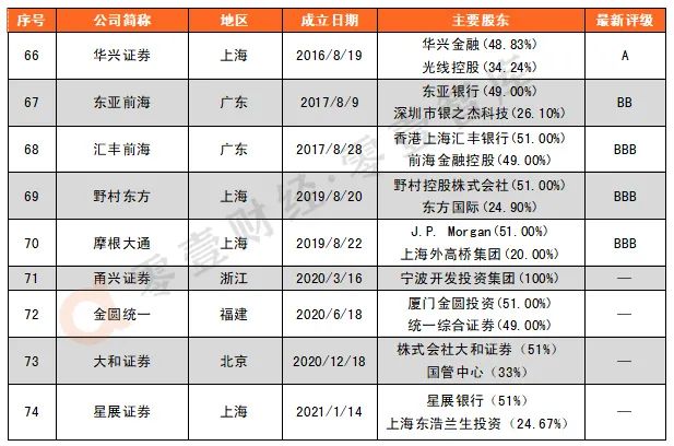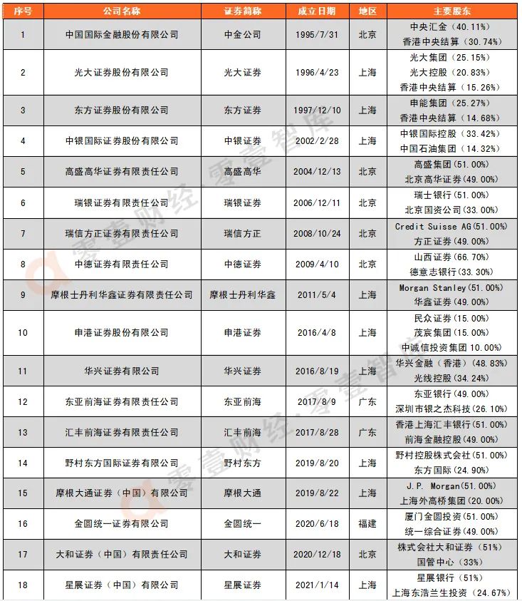 據(jù)零壹智庫不完全統(tǒng)計,目前已成立的合資證券公司有18家,其中外資控股的9家,分別為匯豐前海、瑞信證券、高盛高華、瑞銀證券、摩根士丹利華鑫、摩根大通、野村東方、大和證券和星展證券。這18家合資證券公司注冊地為上海的9家,北京6家,廣東2家,福建1家。