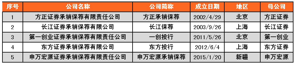 據(jù)證監(jiān)會官網(wǎng)數(shù)據(jù)顯示,目前券商投行子公司有5家,北京、上海各2家,新疆1家。其中除申萬宏源承銷保薦外,其他三家投行子公司的母公司均為上市公司,東方投行母公司東方證券為A+H上市公司。