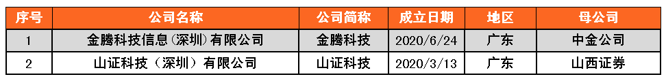 截至2021年7月2日,券商金融科技子公司有2家,分別為金騰科技信息(深圳)有限公司(金騰科技),山證科技(深圳)有限公司(山證科技),注冊地均在廣東。