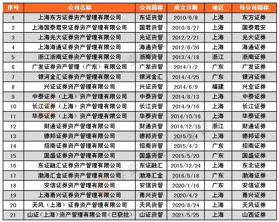 截至2021年7月2日,券商資管子公司有21家,注冊地分布在上海(12家),廣東(6家),浙江(2家),福建(1家)四個省市。自2018年4月27日央行《關(guān)于規(guī)范金融機構(gòu)資產(chǎn)管理業(yè)務(wù)的指導(dǎo)意見》(以下簡稱“資管新規(guī)”)正式發(fā)布,已有4家證券公司獲批成立資管子公司。
