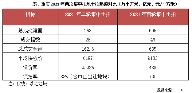 整體來看,在土拍全面升級的影響下,首輪土拍熱度最高的重慶第二次集中土拍市場也急速降溫,在提前中止了9宗地塊后,還流拍了5宗地,流拍率高達(dá)33%,同時整體溢價率也由首輪的43%降至0.02%;28宗成功出讓地塊中僅1宗溢價成交,其余地塊均底價成交,市場熱度降至“冰點”。