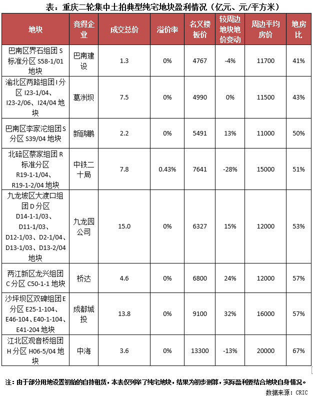而就盈利情況來看,平均地房比為0.52(不考慮含自持租賃的地塊,下同),較首輪明顯提升,尤其是巴南、渝北的一些地塊,地房比低至0.4,典型如巴南區(qū)界石組團(tuán)S標(biāo)準(zhǔn)分區(qū)S58-1/01地塊,樓面價僅有4767元/平方米,這一價格較萬科在周邊拿下的同類地塊樓板價要低4%(該地在首輪集中出讓,樓板價4975元/平方米),按照周邊在售項目平均銷售價11700元/平方米來測算,地房比低至0.41,房地差近7000元/平方米,盈利空間十分可觀。即使是本場土拍中唯一溢價成交的北碚區(qū)蔡家地塊(樓板價7641元/平方米),按照周邊在售均價15000元/平方米來測算的話,地房比也僅有51%,也能保持良好的盈利。
