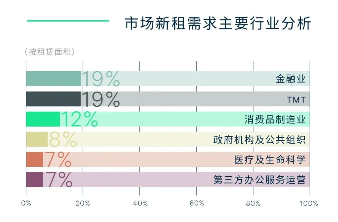 行業(yè)需求方面,在上海加大金融開放力度的背景下,全市場注冊制逐步推進(jìn)為資本市場體制擴(kuò)容,一方面已有的銀行、基金類公司需求較為穩(wěn)定,另一方面也吸引了國內(nèi)外新銀行或資管在上海新設(shè)網(wǎng)點或成立新公司。季內(nèi)以證券、基金、資管擴(kuò)租為主的金融需求進(jìn)一步激活,與TMT一起位居首位,占比均為19%。